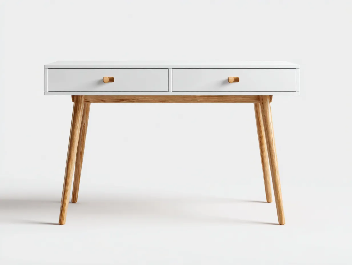 Biurko w stylu skandynawskim łączy prostotę formy z funkcjonalnością, tworząc wygodne miejsce do pracy lub nauki. Jasna kolorystyka oraz naturalne akcenty drewna sprawiają, że mebel harmonijnie wpisuje się w nowoczesne aranżacje wnętrz.