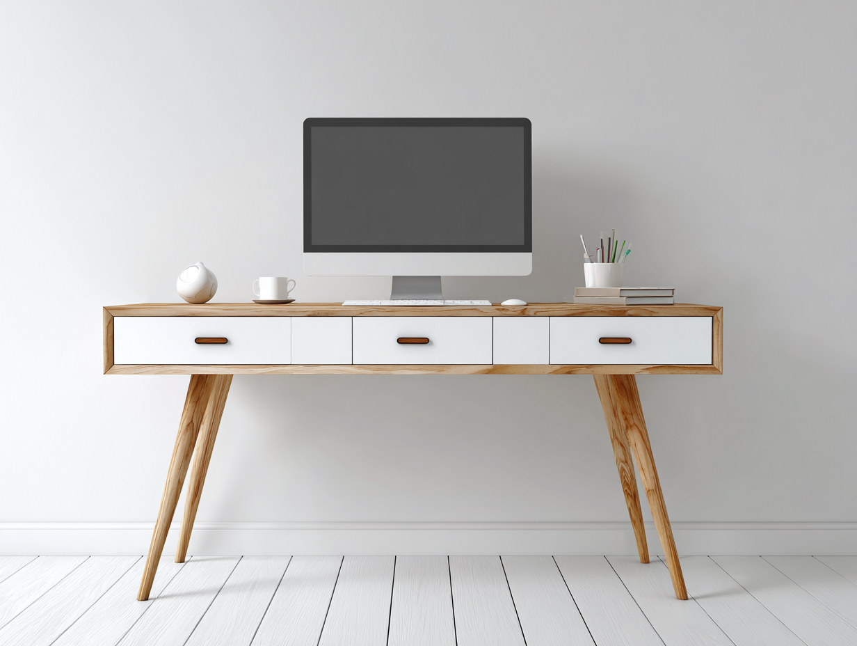 Biurko w stylu skandynawskim łączy funkcjonalność z estetyką inspirowaną naturą. Prosty design oraz kontrast białych frontów z drewnianym blatem sprawiają, że mebel doskonale pasuje do nowoczesnych wnętrz, oferując wygodne miejsce do pracy i nauki.