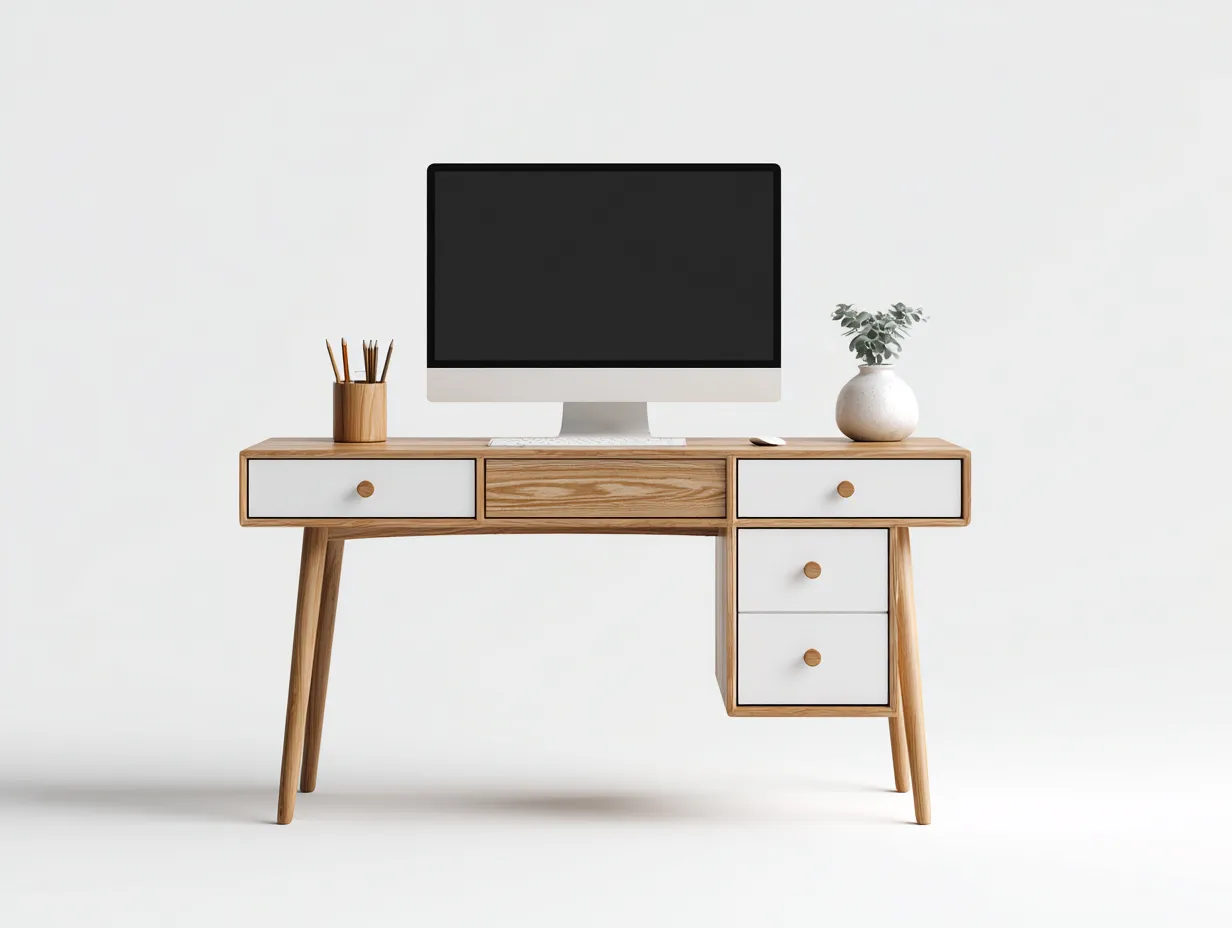 Biurko w stylu skandynawskim łączy funkcjonalność z estetyką inspirowaną naturalnymi materiałami. Prosta forma i harmonijne zestawienie kolorów sprawiają, że mebel doskonale wpisuje się w nowoczesne wnętrza, oferując wygodne miejsce do pracy i nauki.