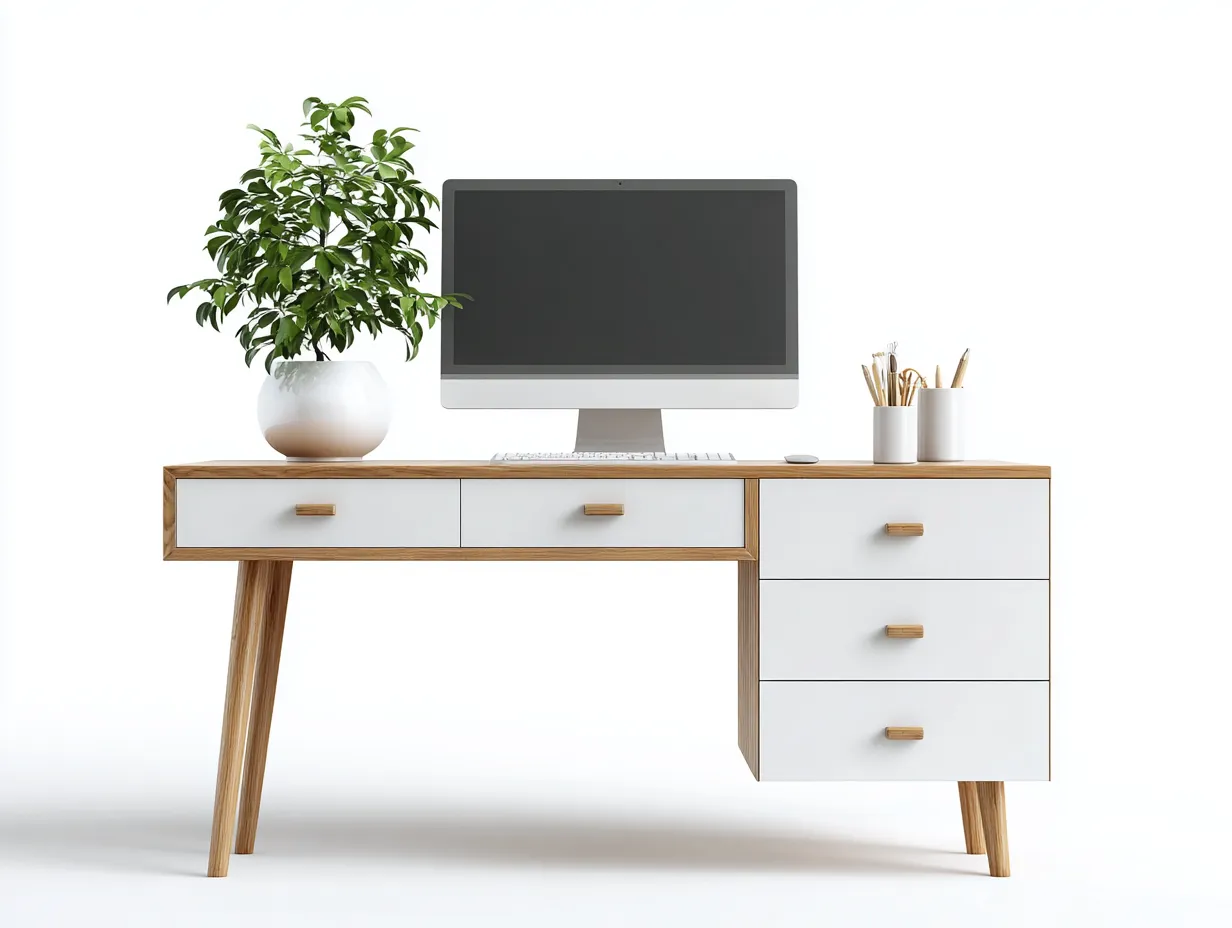 Biurko w stylu skandynawskim zostało zaprojektowane z myślą o funkcjonalnej i estetycznej przestrzeni pracy. Połączenie jasnych frontów z naturalnym odcieniem drewna tworzy harmonijną całość, która sprawdzi się w domowym biurze, pokoju młodzieżowym lub gabinecie.