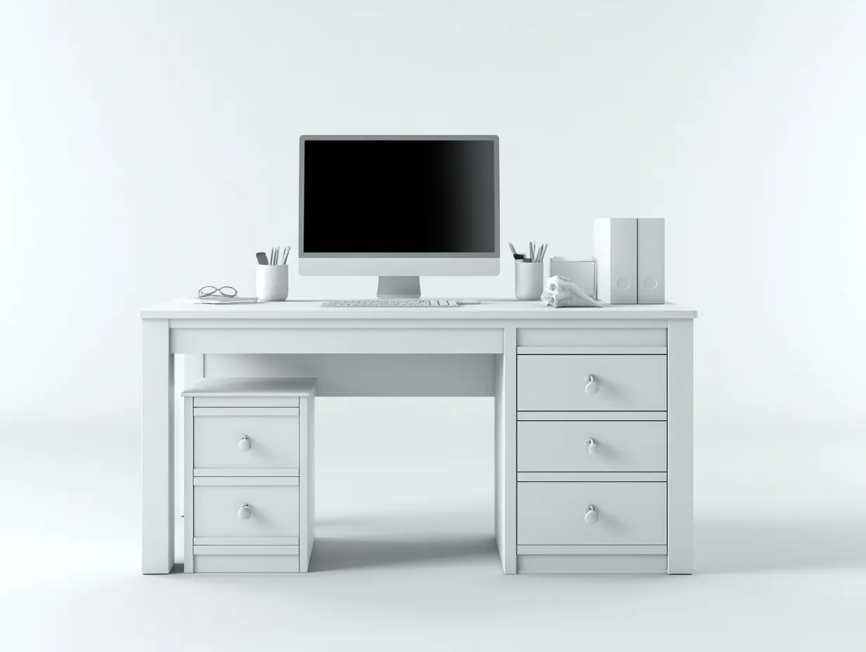 Biurko oferuje praktyczną przestrzeń roboczą oraz wygodne miejsce do przechowywania podręcznych dokumentów i drobnych akcesoriów. Zintegrowana część z szufladami pomaga utrzymać porządek przy blacie, a stabilna konstrukcja sprzyja komfortowemu użytkowaniu w gabinecie, pokoju ucznia lub strefie home office.