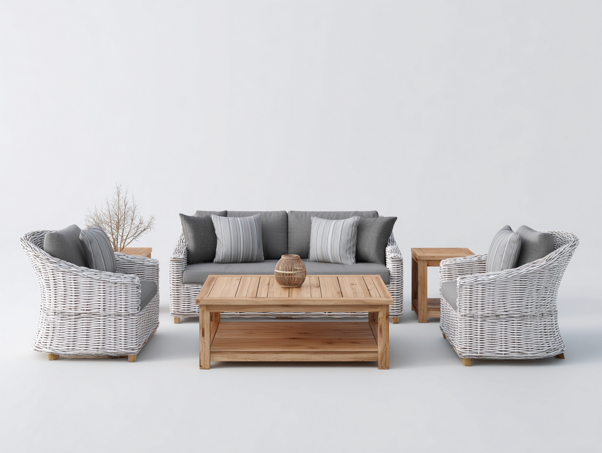 Zestaw wykonany jest z rattanu syntetycznego, drewna oraz tkaniny. Plecionka w odcieniu jasnoszarym została zestawiona z naturalnym kolorem drewna stolików oraz tkaniną w tonacji szaro-beżowej. Całość prezentuje spójny, neutralny wygląd, który łatwo dopasować do otoczenia. Materiały są odpowiednie do użytkowania w warunkach zewnętrznych i łatwe w pielęgnacji.